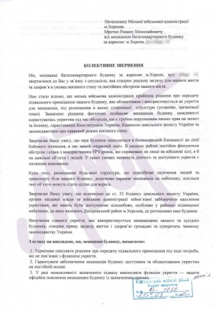У документі зазначається, що рішення міської влади фактично позбавляє мешканців будинку можливості користуватися укриттям під час обстрілів.
